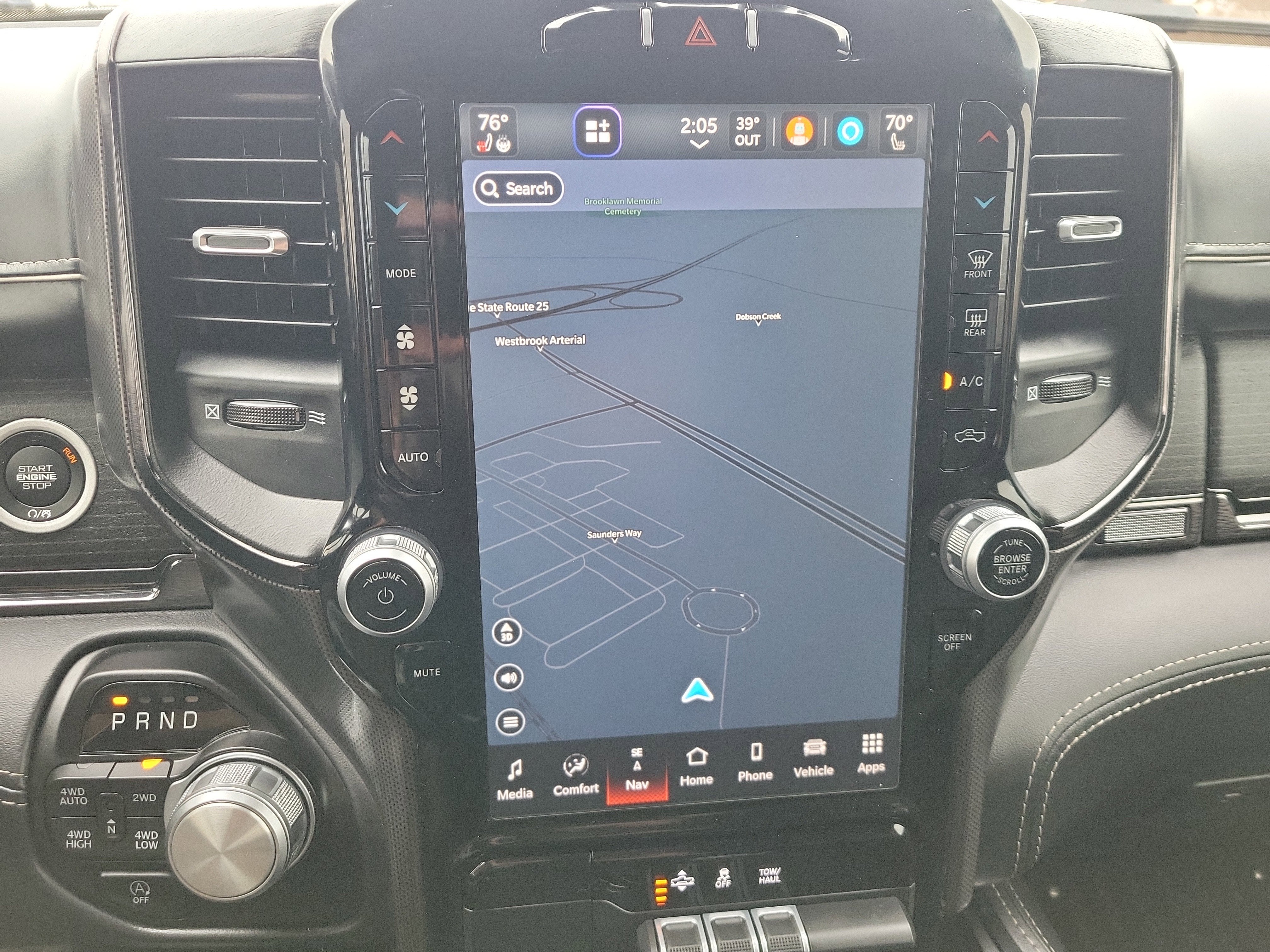 Then the tech hits you. Front and center is Uconnect 5 Nav with a 12.0 Inch Display, navigation, Apple CarPlay and Android Auto, audio memory, and a 10-Speaker Sound System that turns every onramp into your own music video. The Active Noise Control System and passive tuned mass damper help kill road noise, so all you really hear is the soundtrack and just enough HEMI rumble to keep you smiling. A full digital cluster, trip computer, and steering wheel controls make it feel more starship than pickup the second you get rolling.